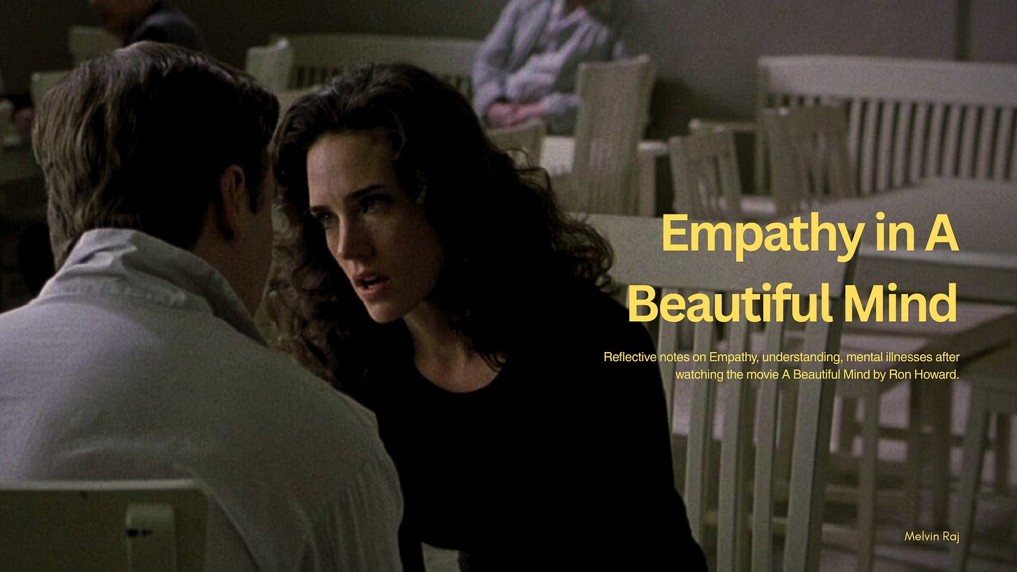 Reflective notes on Empathy, understanding, mental illnesses after watching the movie A Beautiful Mind by Ron Howard.